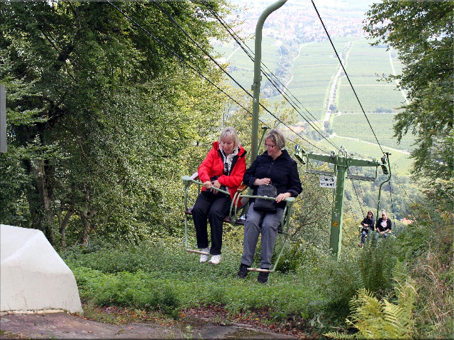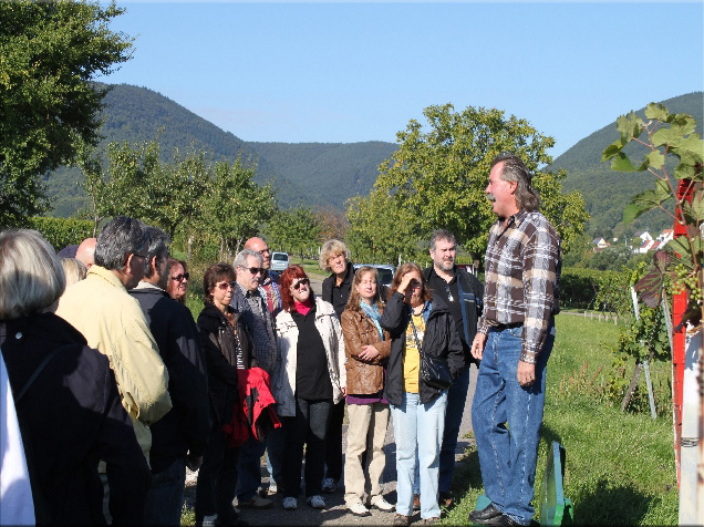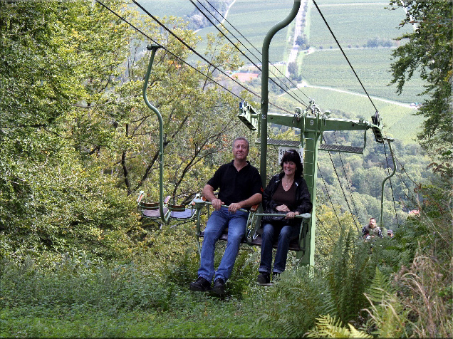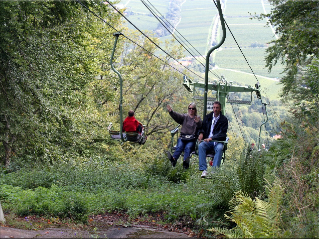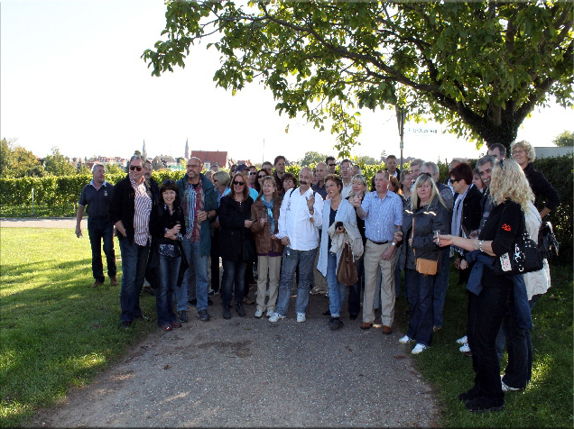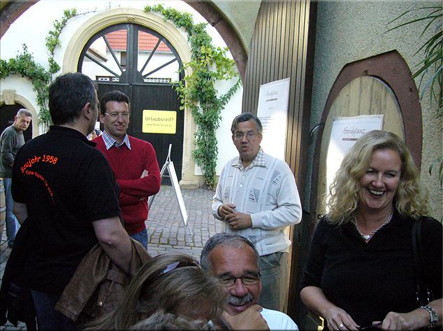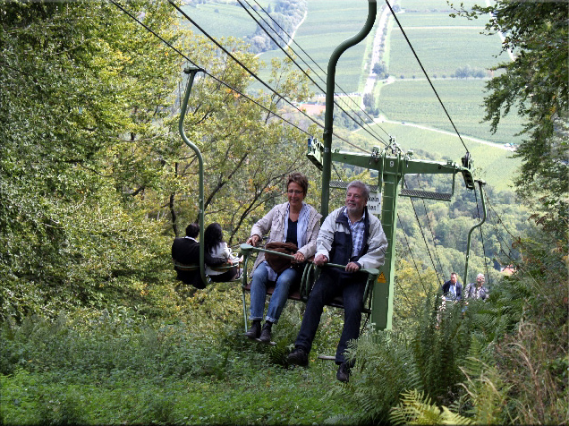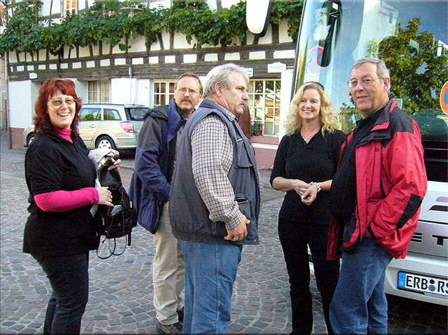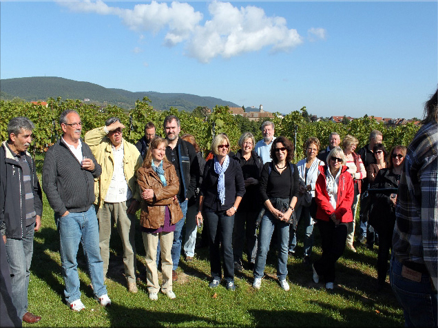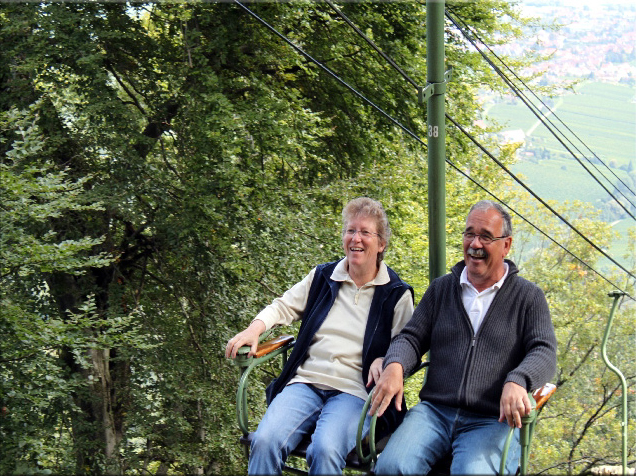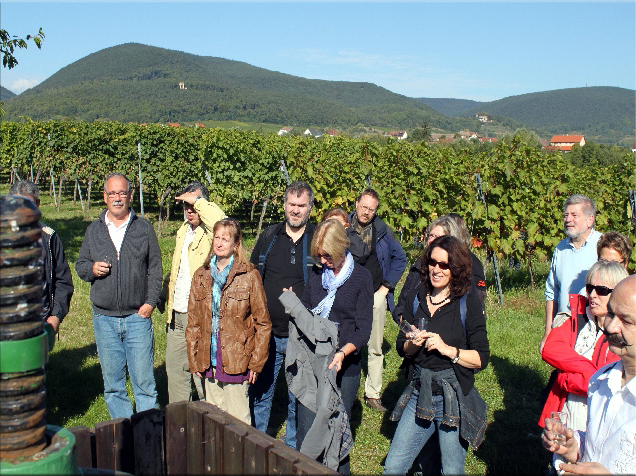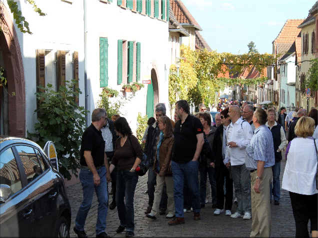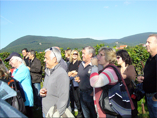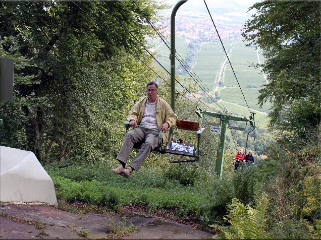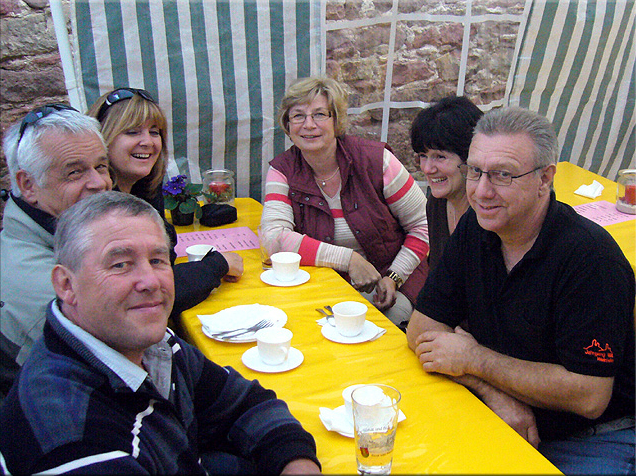 Bei strahlend blauen Himmel fuhren wir, in unserem bis auf den letzten Platz ausgebuchten Reisebus, zuerst nach Edenkoben. Hier nahmen wir an einer Wanderung entlang des Weinlehrpfades teil. Herr Hahn, unser kundiger Führer und ebenfalls Jahrgang 1958, konnte uns hierbei viel Wissenswertes und lustige Anekdoten rund um den Wein erzählen. Ein am Wegrand geparkter "Caddy" war an der Vertiefung des Themas nicht ganz unbeteiligt. Nach unserer kleinen Wanderung, fuhren wir weiter nach Rhodt unter der Rietburg. Hier ging es mit dem Sessellift hinauf zu Höhengaststätte Rietburg zum Mittagessen. Dank des tollen Wetters hatten wir einen wunderschönen Ausblick auf die Rheinebene. Anschließend schwebten wir wieder ins Tal um in Rhodt am "Fest des neuen Weines" teilzunehmen. Biertrinker kamen hier allerdings zu kurz. Es gab nur "Schoppen". Andere Bestellungen, wie z.B. ein Achtel Wein, führten zu verständnislosem Kopfschütteln der einheimischen Bevölkerung. Gegen 18:00 Uhr ging es wieder zurück nach Weinheim, wo wir uns zum Ausklang beim "Alex" einfanden.