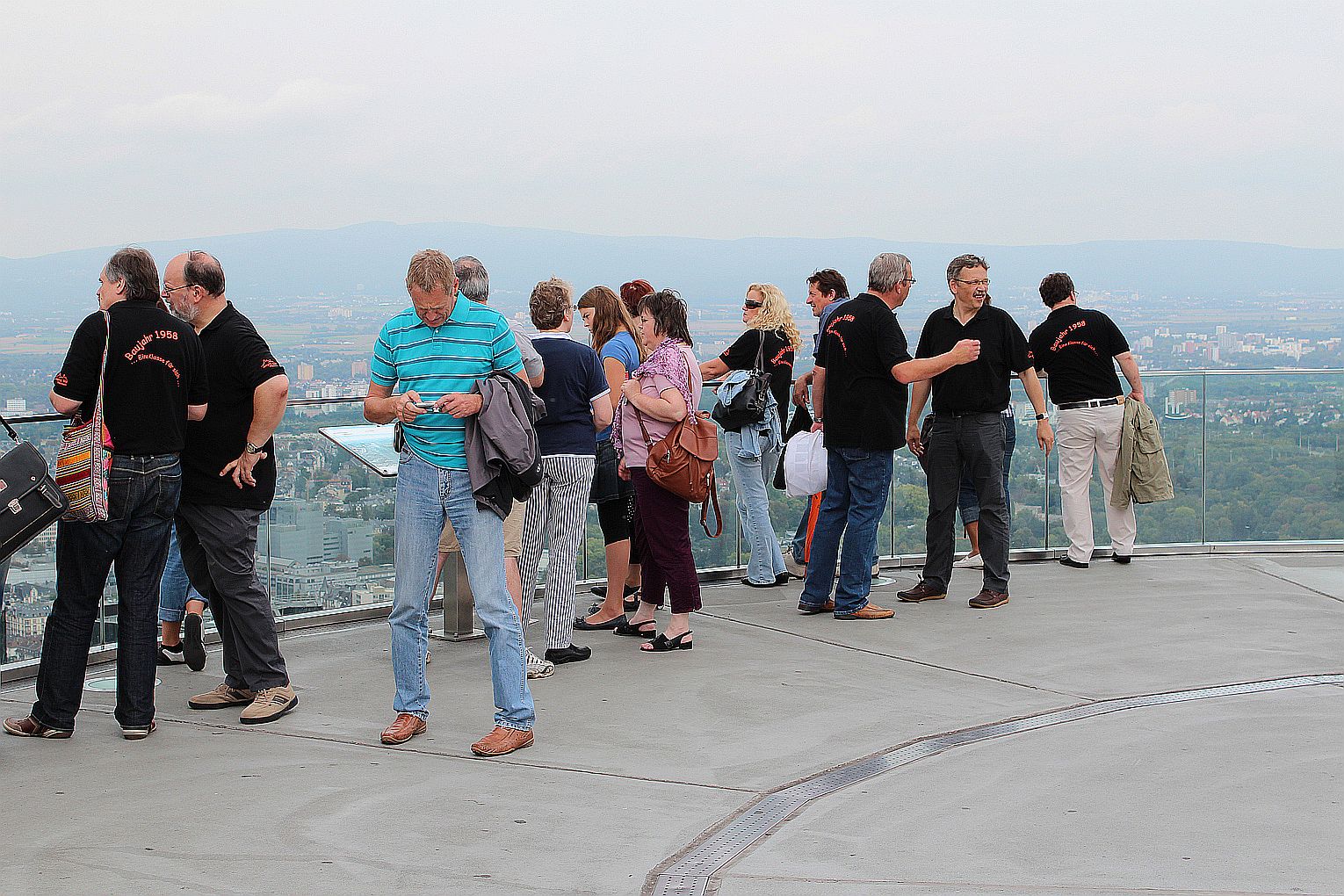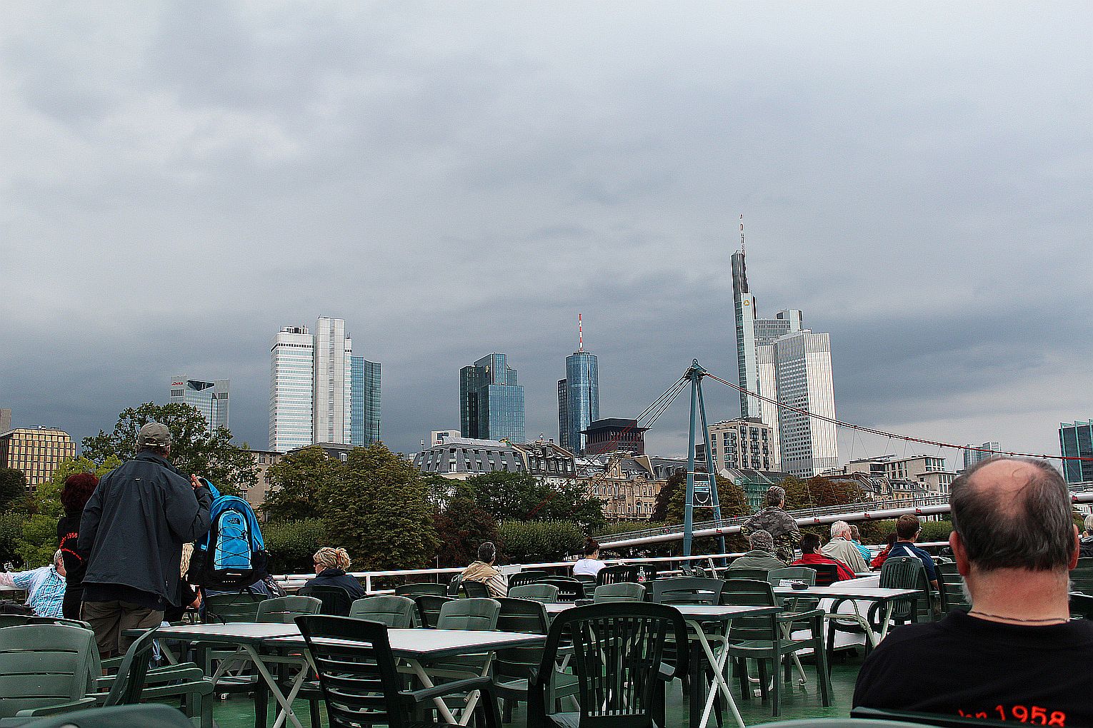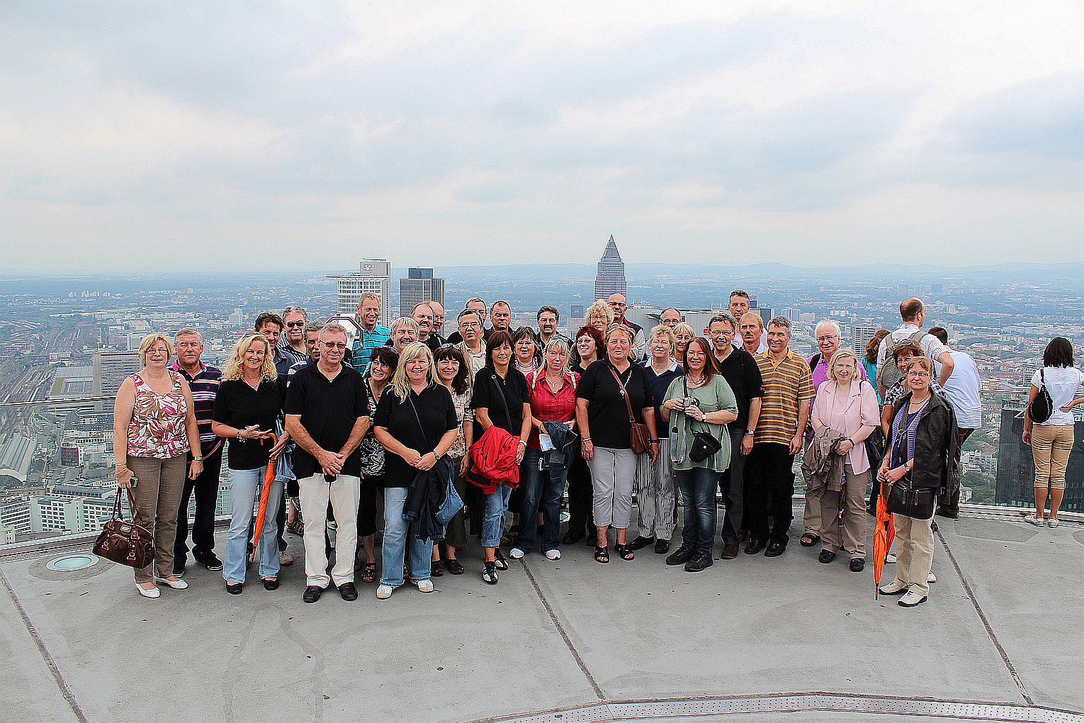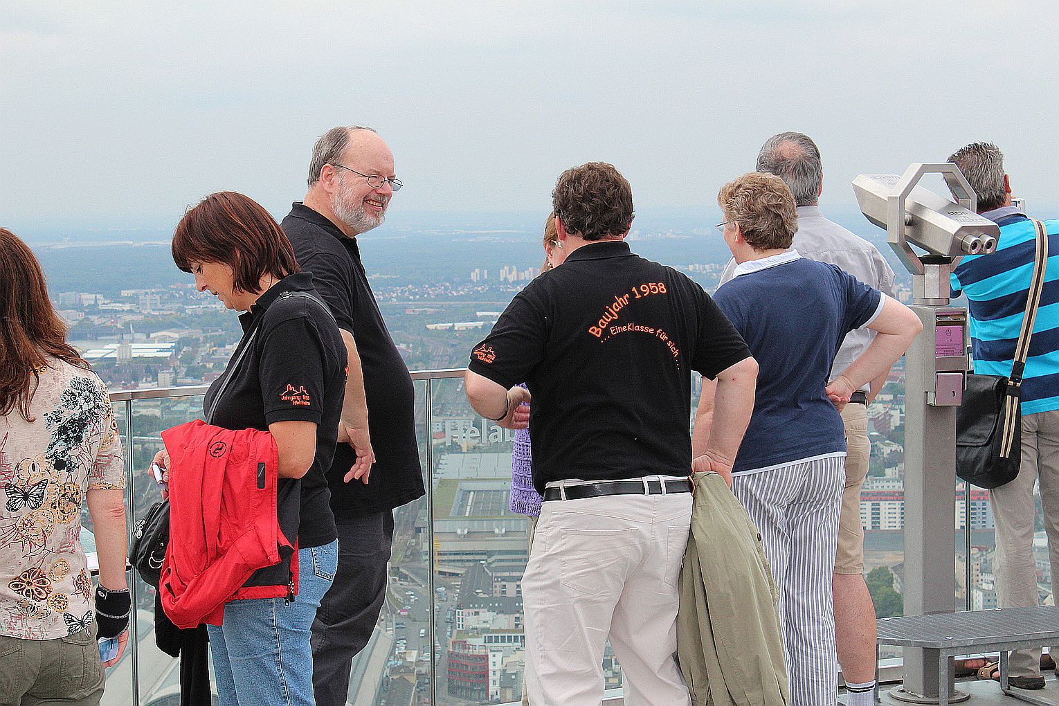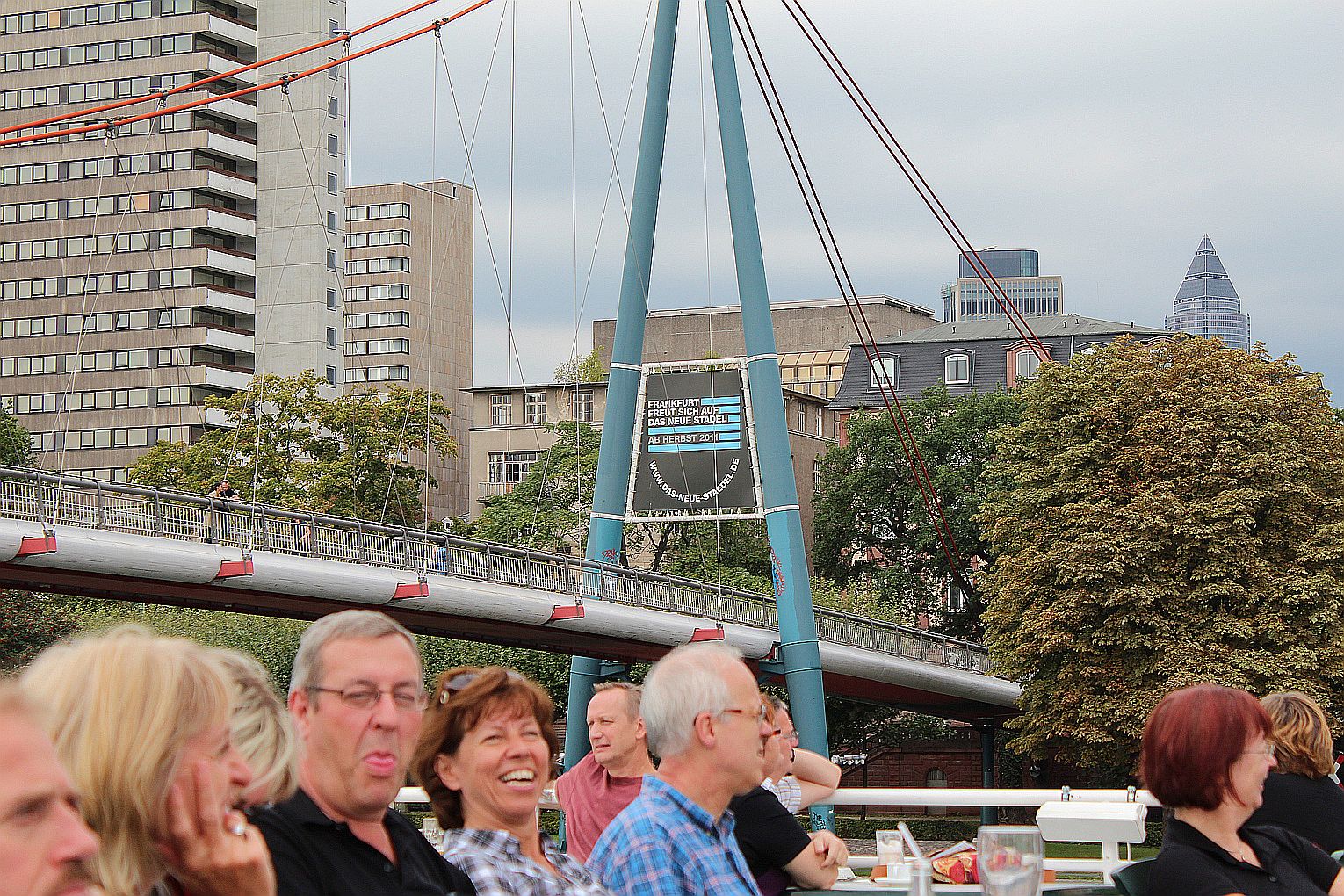 Als erstes stand der Besuch des Maintowers, der 1999 erbaut wurde, auf der Tagesordnung. Von dessen Aussichtsplattform in fast 200 m Höhe bot sich ein grandioser Blick auf die Main-Metropole. Danach ging es weiter zum Römer. Hier traf die Gruppe auf Jahrgangskameradin Karin Ziegler, die maßgeblich für die Organisation vor Ort verantwortlich war. Nach kurzer Stärkung trat man am Eisernen Steg eine Schiffsrundfahrt auf dem Main an und konnten dabei die Skyline Frankfurts aus einer weiteren Perspektive kennen lernen. Den Abschluß bildete ein Besuch einer urigen Äppelwoi-Wirtschaft in Sachsenhausen. Hier konnten die Jahrgängerinnen und Jahrgänger ihr Wissen rund um Frankfurt in Form eines Quiz beweisen. Es gewann Ursel Rotter.