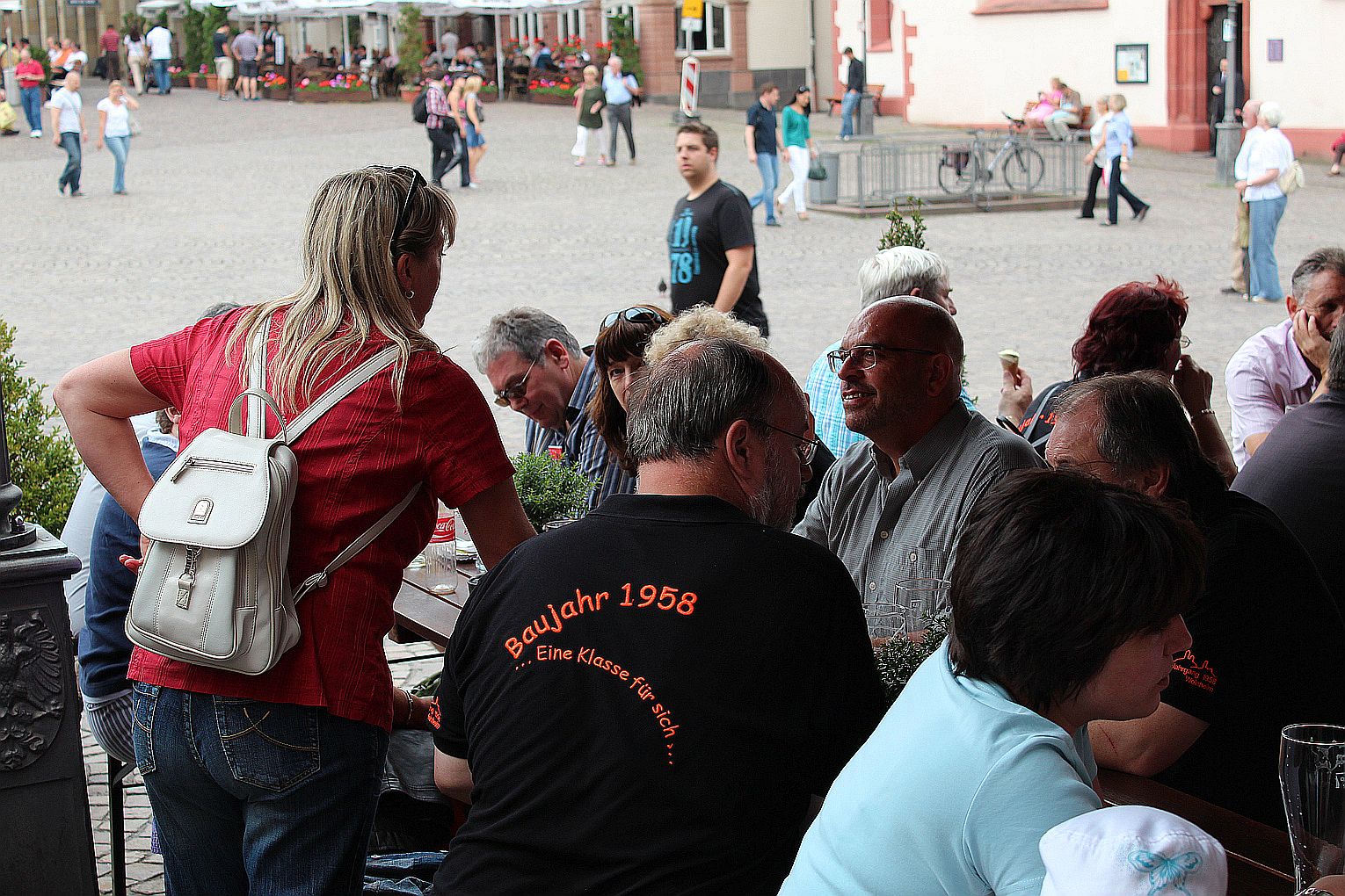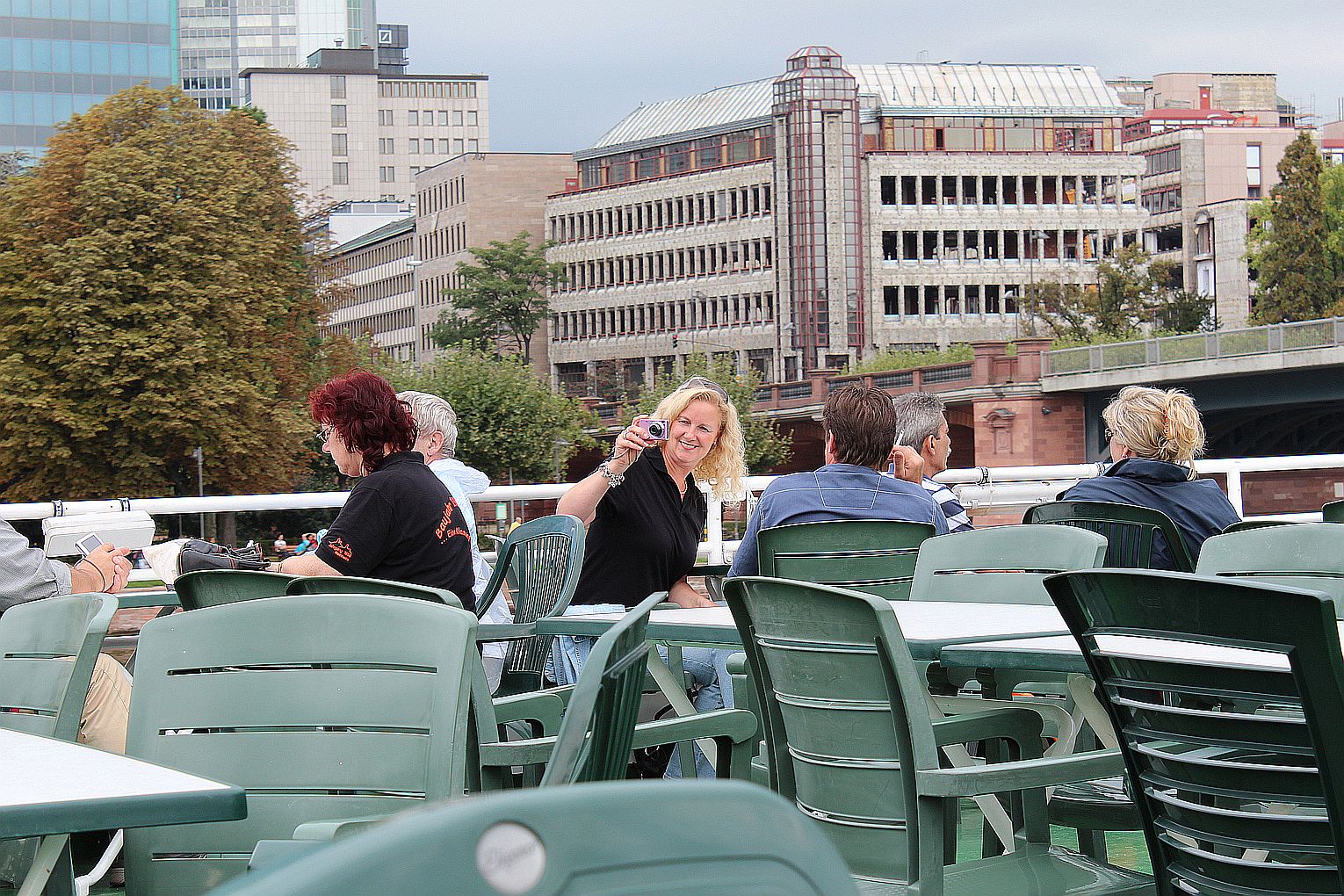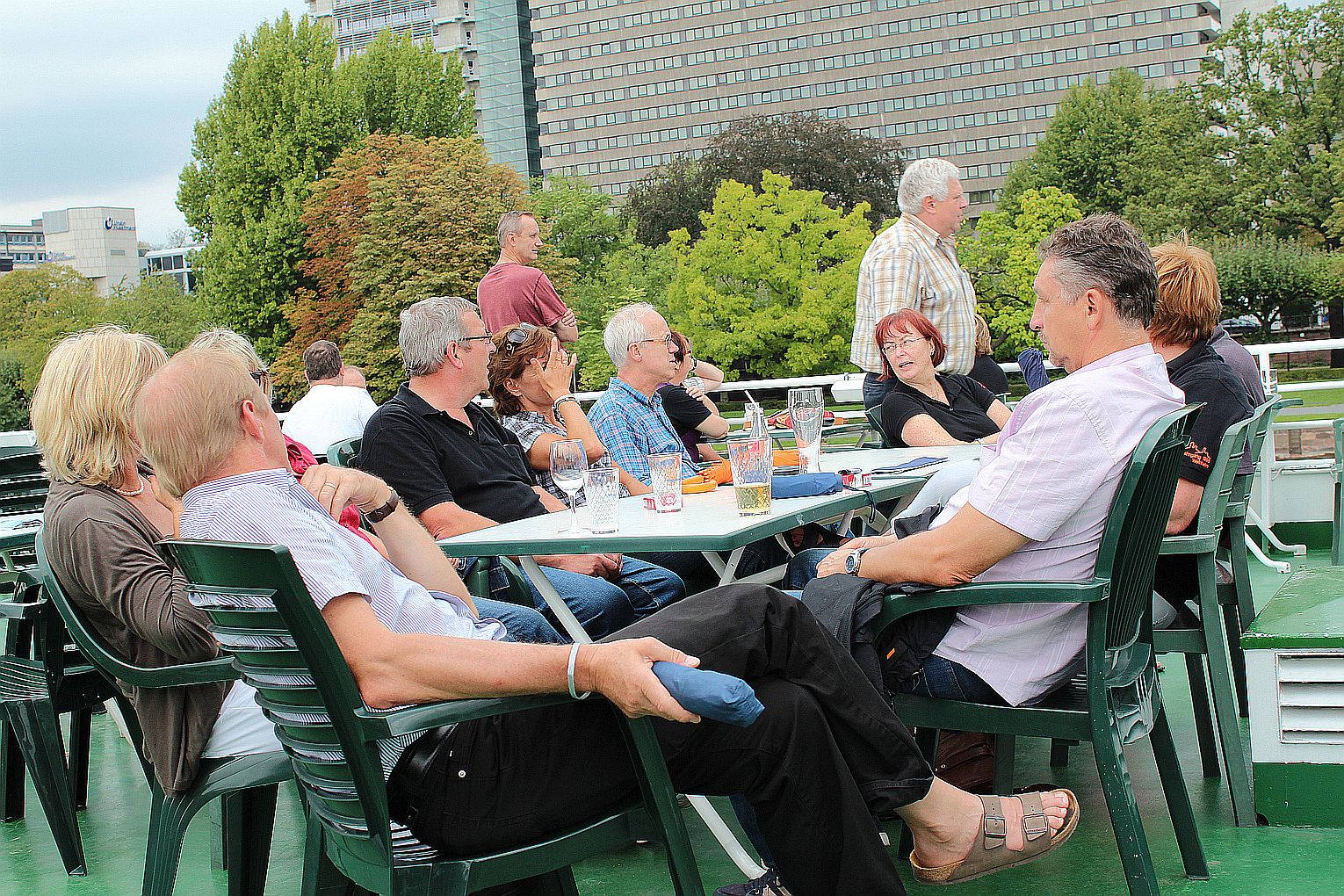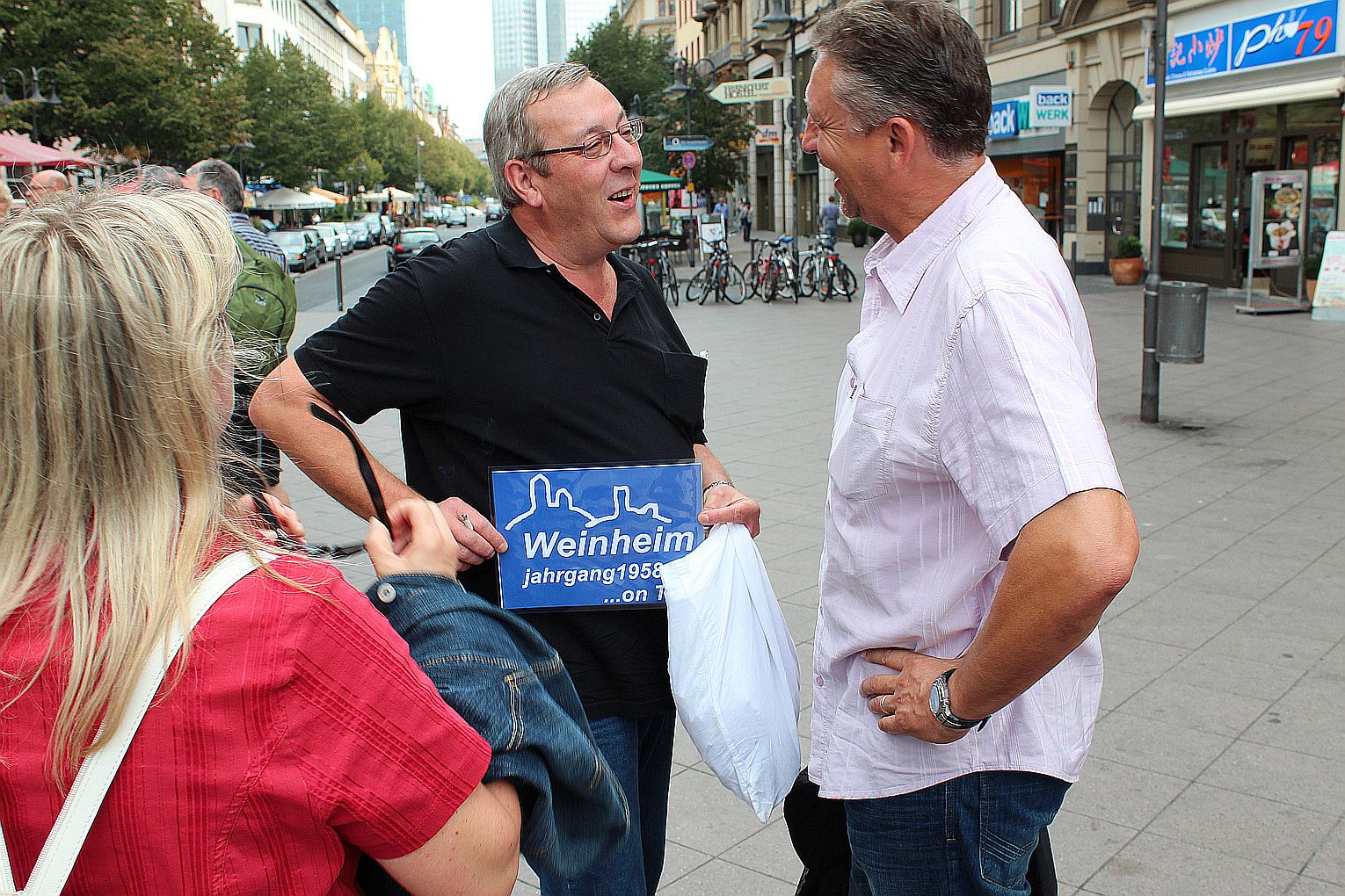 Als erstes stand der Besuch des Maintowers, der 1999 erbaut wurde, auf der Tagesordnung. Von dessen Aussichtsplattform in fast 200 m Höhe bot sich ein grandioser Blick auf die Main-Metropole. Danach ging es weiter zum Römer. Hier traf die Gruppe auf Jahrgangskameradin Karin Ziegler, die maßgeblich für die Organisation vor Ort verantwortlich war. Nach kurzer Stärkung trat man am Eisernen Steg eine Schiffsrundfahrt auf dem Main an und konnten dabei die Skyline Frankfurts aus einer weiteren Perspektive kennen lernen. Den Abschluß bildete ein Besuch einer urigen Äppelwoi-Wirtschaft in Sachsenhausen. Hier konnten die Jahrgängerinnen und Jahrgänger ihr Wissen rund um Frankfurt in Form eines Quiz beweisen. Es gewann Ursel Rotter.