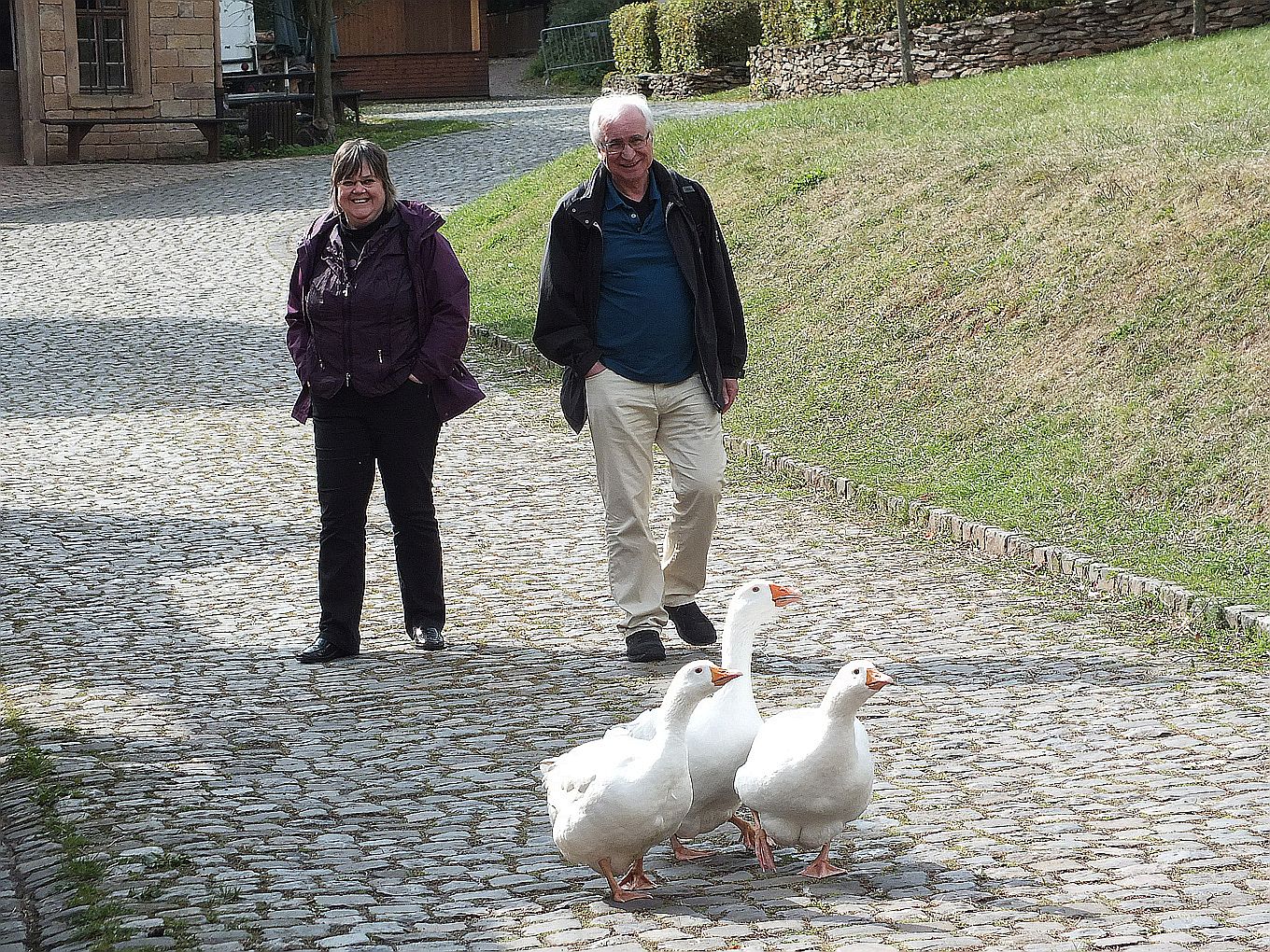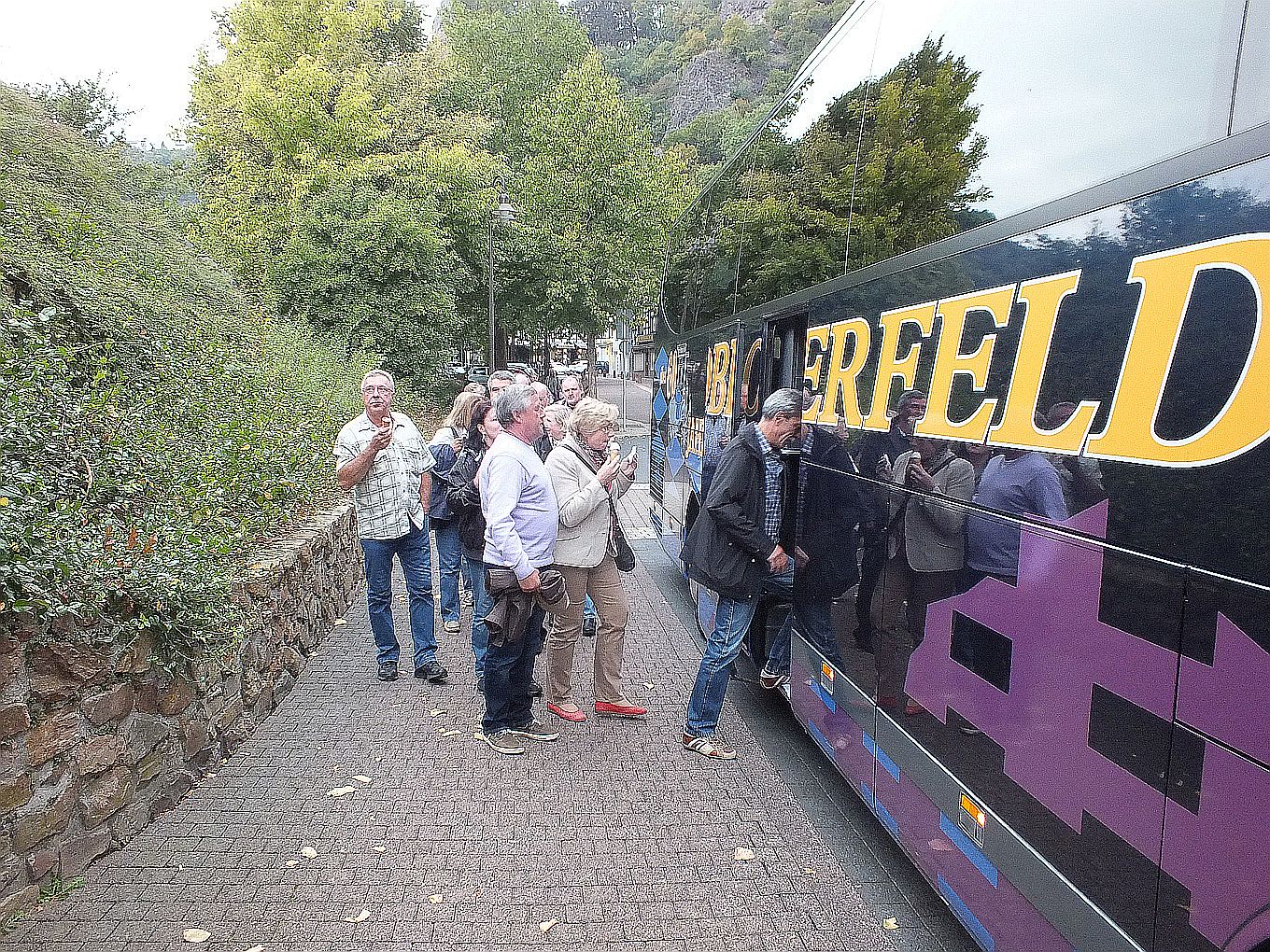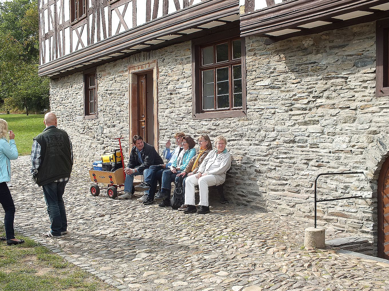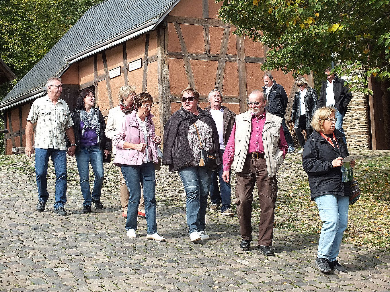 Dieses Mal hatte unser Vergnügungsausschuss um Heide Sommer eine Fahrt ins Freilichtmuseum Bad Sobernheim organisiert. Diese entpuppte sich als eine Reise zurück in die Vergangenheit, die manchen jedoch noch sehr vertraut war. Nach mehrstündiger Exkursion und Besuchs des Museums eigenen Souvenir-Shops, wo unter anderen Schiffertafeln, Griffel und Brummkreisel neue Besitzer fanden, fuhren wir weiter in die Schmuck- und Edelsteinstadt Idar-Oberstein. Wo wir, nach einem Bummel durch die verkaufsoffene Fußgängerzone, in der Schloßschänke die kulinarischen Spezialitäten der Region kennen lernen durften. Die anschließende Heimfahrt stellte die Teilnehmer nochmals vor eine größere Herausforderung, mussten Sie doch wieder ein Quiz lösen, welches unser Jahrgangsmitglied Reinhold Albrecht ausgearbeitet hatte.